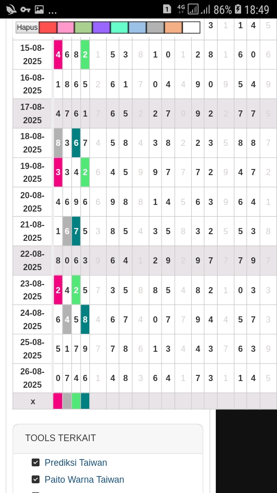 Prediksi Taiwan Sabtu, 04-10-2025 Merupakan Prediksi Otomatis yang menggabungkan Metode Kalender Togel Dengan LN Generator yang akurasi prediksinya sudah kita ketahui bersama. Jadi harap Maklum Jika kadang meleset Prediksi Taiwan kita. Jadikan ini sebagai perbandingan saja dan tetap Utamakan karya sendiri