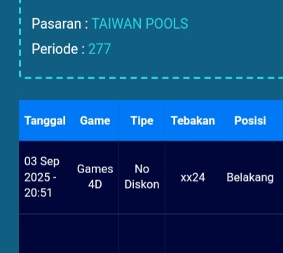 Prediksi Taiwan Senin, 08-09-2025 Merupakan Prediksi Otomatis yang menggabungkan Metode Kalender Togel Dengan LN Generator yang akurasi prediksinya sudah kita ketahui bersama. Jadi harap Maklum Jika kadang meleset Prediksi Taiwan kita. Jadikan ini sebagai perbandingan saja dan tetap Utamakan karya sendiri